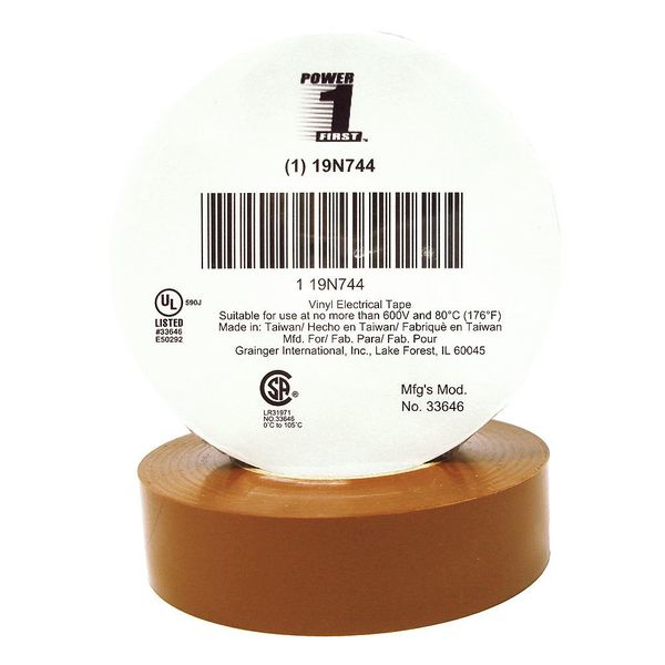 Vinyl Electrical Tape, 3/4 in W x 66 ft L, 7 mil thick, Brown, 1 PackSKU G4531572Categories Adhesives, Epoxy & Sealants , Electric and Cordless ToolsDescription Insulating Electrical Tape, General Purpose, Vinyl, Tape Adhesive Material Rubber, 3/4 in, 66 ft, 7 mil, Approved Vendor, Series Premium, Brown, Minimum Tape Performance Temperature 30 Degrees F, Maximum Tape Performance Temperature 220 Degrees F, Voltage Rating 600 V, Continuous Roll, Single-SidedgraingerSKU: null, mscSKU: null, zoro_no: G4531572, mongo_id: 65bbe5ed3aaddbd5a9ff654a