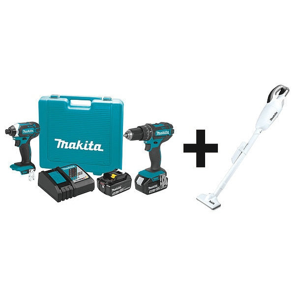 SKU G9223199Categories Electric and Cordless ToolsDescription Cordless Combination Kit, Cordless Tools Included Hammer Drill, Impact Driver, Vacuum, Voltage 18 V, Power Source Cordless, Number of Tools 3, Battery Capacity (2) 4.0 Ah, Includes Contractor Bag, Tool Brand Makita, Series 18V LXT, Battery Included (2) 33RT43, Mfr. No. BL1840B, Number of Batteries Included 2, Battery Model No. (2) Mfr. No. BL1840B, Battery Series 18V LXT, Charger (1) Mfr. No. DC18RC, Charger Included Yes, Cordless Tool Kit Contents (3) Bare Tools, (2) Batteries, (1) ChargergraingerSKU: null, mscSKU: null, zoro_no: G9223199, mongo_id: 65bbe5e53aaddbd5a9ff4463