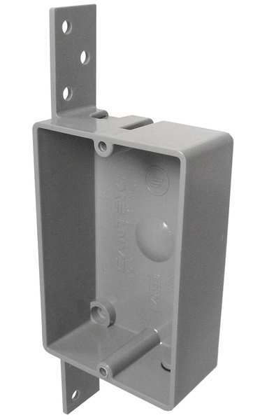 SKU G2057851Categories Electric and Cordless ToolsDescription Electrical Box, Box Type Square with Bracket, Number of Gangs 1, Bracket Type Flat for Mounting to Stud, Capacity 8 cu in, Material PVC, Number of 1/2 In. Back Knockouts 4, Number of 1/2 In. Side Knockouts 0, Clamp Type -, - Hub Location, Rated -, Nominal Depth 1 1/4 in, Nominal Length 3 1/2 in, Nominal Width 2 3/8 in, Color Gray, Standards ULgraingerSKU: 4FZC4, mscSKU: , zoro_no: G2057851, mongo_id: 65bbe5d73aaddbd5a9fedd2b