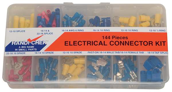 Electrical Connector Asst, 144 PcsSKU G4108203Categories Electric and Cordless ToolsDescription Crimp Connector Kit, For Conductor Material Copper, Insulation Material Vinyl, Maximum Operating Temperature 221 Degrees F, Minimum Wire Size 22 AWG, Maximum Wire Size 10 AWG, Number of Pieces 144, Termination Style Crimp, Tools Included None, Manufacture Model Numbers Included 878101, BVT1, BVT2, BVT5, FDV2-250, MDV2-250, RV5-5, RV5-6, RVL2-3.7, RVS2-5, SV5-5, SVS1-5, SVS2-5, RoHS Compliant Yes, Connector Assortment Type Crimp TerminalsgraingerSKU: 3KUN1, mscSKU: , zoro_no: G4108203, mongo_id: 65bbe7ee9a749db822765248