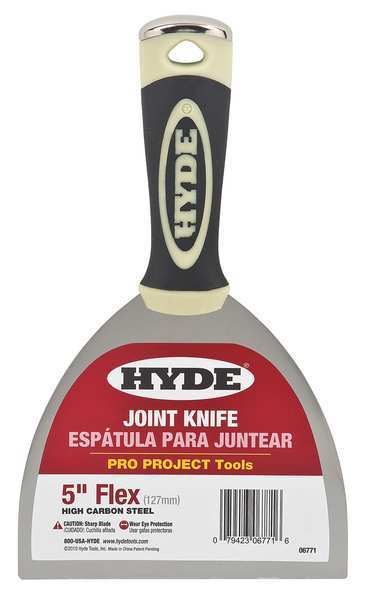 Joint Knife, Flexible, 5", Carbon SteelSKU G4570562Categories Hand Tools , Raw MaterialsDescription Drywall and Putty Knives, Nonsparking No, Flexible, Blade Type Standard, Blade Width 5 in, Blade Material Carbon Steel, Handle Material Polypropylene/TPE, Joint Knife, Blade Length 4 in, Handle Length 4 1/2 in, Handle Design Hammer Head, Soft Grip, No. of Edges 1, Color Black/Cream, Overall Length 8 ingraingerSKU: null, mscSKU: null, zoro_no: G4570562, mongo_id: 65bbe6f33aaddbd5a9065510
