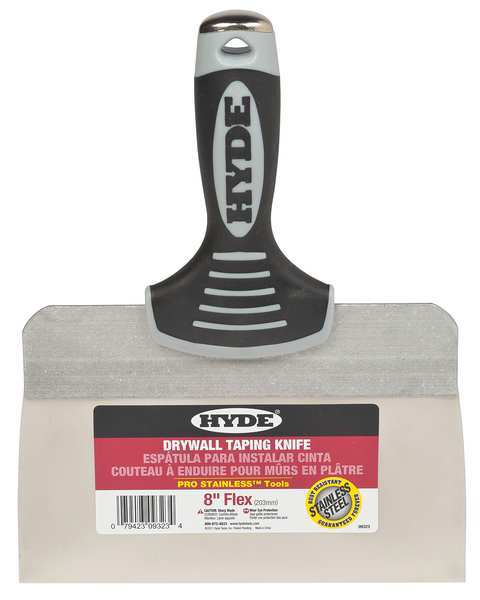 $20.59 / eachWeb priceTaping Knife, Flexible, 8", SSSKU G4556334Categories Hand ToolsDescription Drywall and Putty Knives, Nonsparking No, Flexible, Blade Type Extruded Backing, Tapered, Blade Width 8 in, Blade Material Stainless Steel, Handle Material Plastic, Taping Knife, Blade Length 3 1/2 in, Handle Length 6 in, Handle Design Hammer Head, Soft Grip, No. of Edges 1, Color Black/Cream, Overall Length 10 ingraingerSKU: 24Z422, mscSKU: , zoro_no: G4556334, mongo_id: 65bbe8289a749db82277850d