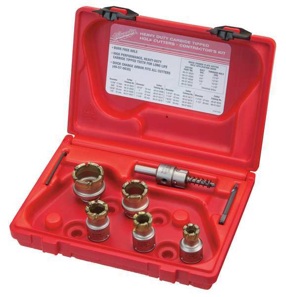 $437.49 / eachWeb priceCarbide Cutter Steel Plate Contractor's Kit - 7PCSKU G5129022Categories Hand ToolsDescription Hole Cutter Kit, Primary Material Application Metal, Materials Cut Steel Plate, Arbor Design Included, Tooth Material Carbide Tipped, Number of Teeth (Hole Cutters Only) 6, Max. Cutting Depth 1/2 in, Impact Rated No, Hole Cutter Sizes (Hole Cutters) 11/16 in, 13/16 in, 15/16 in, 1 1/8 in, 1 3/8 in, Saw Size Range 11/16 in to 1 3/8 in, Number of Hole Cutters 5, Shank Size 1/2 in 3 Flat, Pilot Drill Size 1/4 in dia x 2 3/4 in L, Number of Pieces 7graingerSKU: 48Z663, mscSKU: 58428954, zoro_no: G5129022, mongo_id: 65bbe7ca9a749db822758511