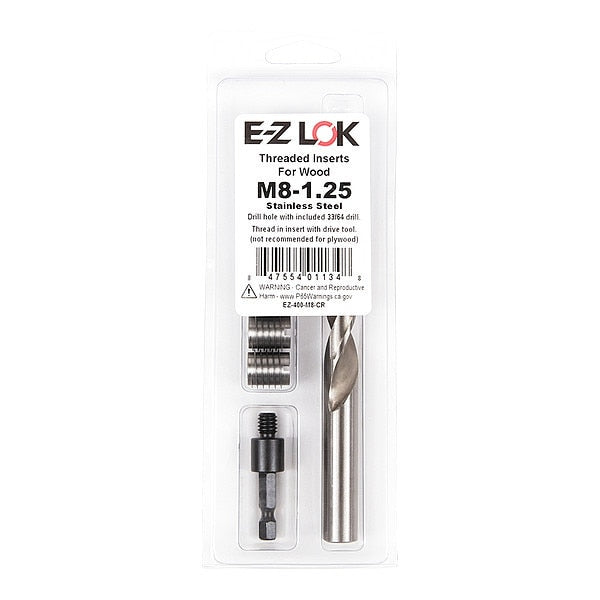 SKU G309228331Categories Hand ToolsDescription Knife Thread Insert, System of Measurement Metric, Insert Diameter 12.7 mm, Overall Length 15.875 mm, Internal Thread Size M8-1.25, Thread Direction Right Hand, Thread Type Coarse, Material Stainless Steel, Material Grade/Class 18-8, Finish Plain, Drive Type Slotted, Drill Bit Size 33/64 in, Compatible Material Wood, Minimum Material Thickness 19 21/32 mm, Maximum Hole Diameter 13.106 mm, Compatible with Manufacturer Model Number DT-M8, Includes (5) Threaded Inserts, Drill, Drive Tool$49.04 / eachWeb price