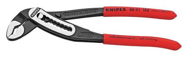 7 1/4 in Knipex Alligator V-Jaw Tongue and Groove Plier Serrated, Plastic GripSKU G9750307Categories Hand ToolsDescription Tongue and Groove Plier, Plier Type Tongue & Groove Pliers, Adjustment Mechanism Groove Joint, Jaw Texture Serrated, Jaw Shape V, Overall Length 7 1/4 in, Maximum Jaw Opening 1 1/2 in, Number of Jaw Positions 9, Jaw Width 7/8 in, Jaw Length 1 in, Grip Style Standard Cushion, Non-Sparking No, Insulated No, Tether Ready No, Features Box-Joint Design, Hardened Teeth To 61 Hrc, High Stability Double Guide, Pinch Guard, Robust Construction, Self-Locking, Finish Atramentized (Phosphate Coat)graingerSKU: 38GU41, mscSKU: 05903372, zoro_no: G9750307, mongo_id: 65bbe9d422d7a989a997dec8