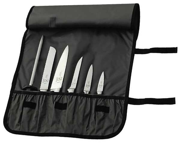 Forged Knife Roll Set, 7 Piece SetSKU G0357384Categories Hand ToolsDescription Knife Set, FDA Compliant No, Forged/Stamped Forged, Knife Type Knife Set, Blade Material Steel, Dishwasher Safe No, Handle Color Black, Blade Type Wavy Edge, Includes (7) Pocket Roll, M20003 Paring Knife, M20206 Flexible Boning Knife, M20405 Utility Knife, M20508 Wavy Edge Bread Knife, M20608 Chef's Knife, M21010 Traditional Steel, Overall Length 20 1/2 in, NSF Certified Yes, Handle Material Santoprene, Blade Length 8 in, Metal Detectable No, Number of Implements 6graingerSKU: 6AKJ1, mscSKU: , zoro_no: G0357384, mongo_id: 65bbe9ad22d7a989a996d0eb