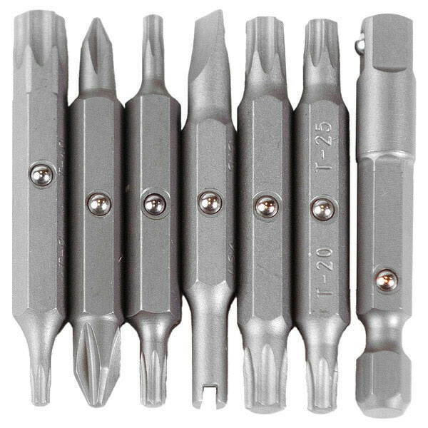 SKU G305735635Categories Hand ToolsDescription Screwdriver Bit Set, No. of Pieces 7, Hex Shank Size 1/4 in, Fastening Tool Material S2 Steel, Impact Rated No, Hand, Includes 1/4 in Socket Adapter, Flat 5.5 - VST (Valve Stem), Phillips 1-2, Torx 10-15, Torx 20-25, Torx 27-30, Torx 9-40, Bit Length 2 ingraingerSKU: , mscSKU: , zoro_no: G305735635, mongo_id: 65bbe9f322d7a989a9989075