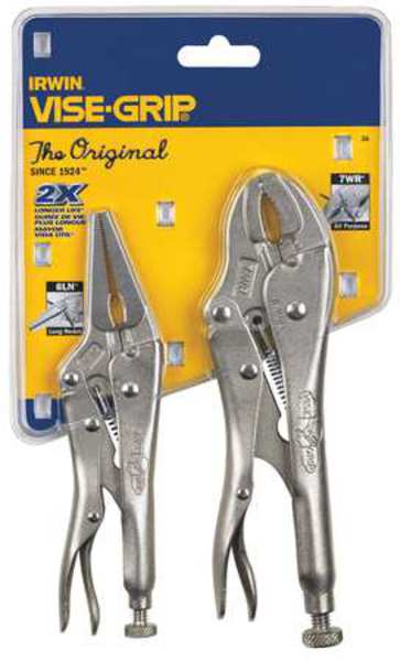 2 Piece Original Locking Pliers Set Plain Grip HandleSKU G4010666Categories Hand ToolsDescription Locking Pliers Set, Plier Types Locking Pliers, Jaw Shape Curved, Handle Style Plain Grip, Overall Length 6 in, 7 in, Maximum Jaw Opening 1 1/2 in, 2 in, Jaw Length 3/4 in, 1 3/4 in, Additional Tool Functions Cable Cutter, Tether Ready No, Number of Pliers 2, Non-Sparking No, Container Type None, Features Classic Trigger Release Designed to Provide Maximum Locking Force, Hardened Teeth, For Maximum Outside Diameter 1 1/2 in, 2 in, Grip Style Plain, Includes 6LN, No. 7WR, Jaw Thickness 3/8 ingraingerSKU: 10J864, mscSKU: 09902735, zoro_no: G4010666, mongo_id: 65bbe8d122d7a989a99195c4