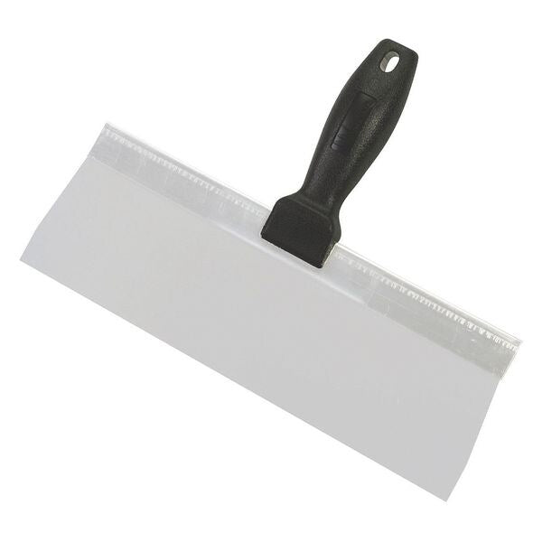 Taping Knife, Flexible, 10", SSSKU G4791281Categories Hand ToolsDescription Drywall and Putty Knives, Nonsparking No, Flexible, Blade Type Tapered, Blade Width 10 in, Blade Material Stainless Steel, Handle Material Polypropylene/TPR, Taping Knife, Blade Length 3 in, Handle Length 5 5/8 in, Handle Design Ergonomic, No. of Edges 1, Color Black/Blue, Overall Length 8 3/4 ingraingerSKU: 13A722, mscSKU: , zoro_no: G4791281, mongo_id: 65bbe93422d7a989a9940a63
