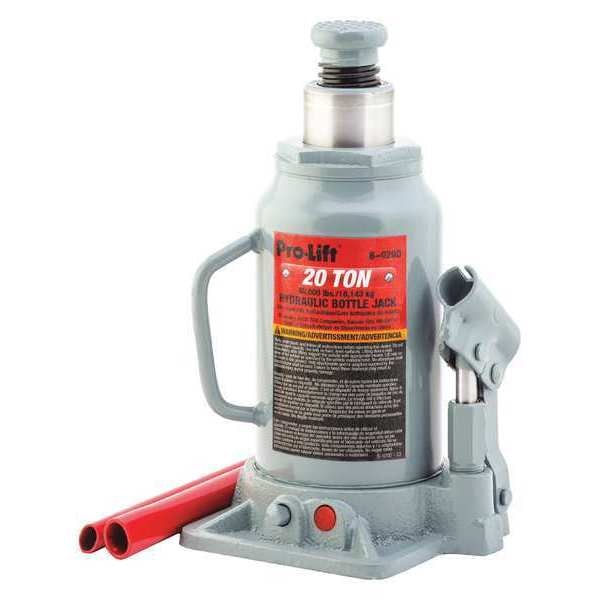 $153.74 / eachWeb priceBottle Jack, Hydraulic, 20 tonsSKU G7442088Categories Lifting and HydraulicsDescription Bottle Jack,Hydraulic,20 tons, Load Capacity 20 ton, Body Material Steel, Lifting Actuator Manual Handle, Minimum Lift Height 9 1/2 in, Maximum Lift Height 18 3/4 in, Power Source Mechanical, Standards ASME, PASE, Base Length 5 1/2 in, Base Width 5 3/8 in, Extension Screw Length 1 5/8 in, Features Extension Screw Adjusts to Accommodate Work Height, Heat Treated Critical Stress Areas, Ideal for Auto, Truck Service, Farm, and Shop Use, By-Pass Device Protects Against Over-PumpinggraingerSKU: 59DM42, mscSKU: , zoro_no: G7442088, mongo_id: 65bbe7113aaddbd5a907181a