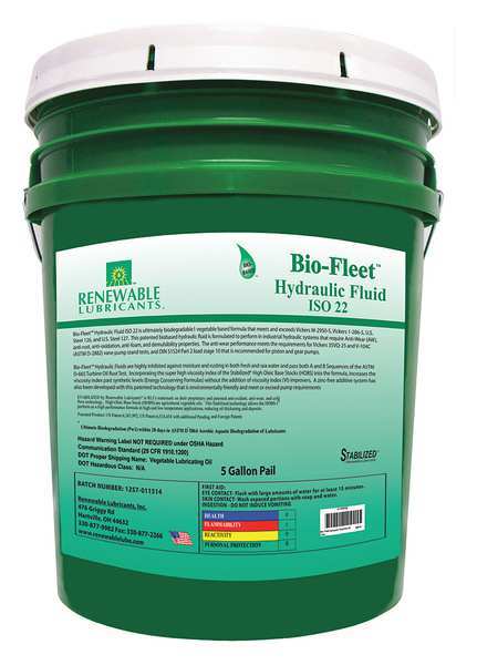 $238.74 / eachWeb price5 gal Bio-Fleet Hydraulic Fluid Pail 22 ISO ViscositySKU G8724651Categories Lifting and HydraulicsDescription Hydraulic Oil,Natural Ester Base,Size 5 gal.,Container Type Pail,SAE Grade Not Specified,ISO Viscosity Grade 22,Viscosity Index 182,Color Yellow,Temp. Range -40 Degrees to 401 Degrees F,Pour Point -38 Degrees C,Flash Point 205 Degrees C,Specific Gravity 0.88,Four-Ball Wear 0.4mm,Viscosity @ 40C 22.3 cSt,Viscosity @ 100C 5.8 cSt,Application For Hydraulic Equipment Operating Outside Where The Equipment Require More Frequent Oil Change Intervals,For Use with Piston and Gear PumpsgraingerSKU: 30WK82, mscSKU: , zoro_no: G8724651, mongo_id: 65bbe91622d7a989a9934d02