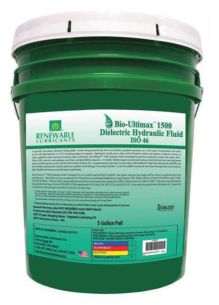 5 gal Bio-Ultimax 1500 Dielectric Hydraulic Fluids PailSKU G8724676Categories Electric and Cordless Tools , Lifting and HydraulicsDescription Hydraulic Oil,Natural Ester, Bio-Synthetic Base,Size 5 gal.,Container Type Pail,SAE Grade Not Specified,ISO Viscosity Grade 46,Viscosity Index 201,Color Yellow,Temp. Range -40 Degrees to 464 Degrees F,Pour Point -40 Degrees C,Flash Point 240 Degrees C,Specific Gravity 0.88,Four-Ball Wear 0.3 to 0.4mm,Viscosity @ 40C 44.5 cSt,Viscosity @ 100C 9.4 cStgraingerSKU: null, mscSKU: null, zoro_no: G8724676, mongo_id: 65bbe6513aaddbd5a9020515