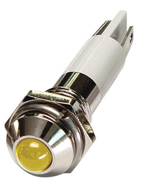 SKU G4657676Categories Lighting ToolsDescription Round Indicator Light, LED, Brass Plated Chrome, LED, Plastic (ABS), Yellow, Voltage 110V AC, Size 8mm Mounting dia, Electrical Connection Male .110 Connector, Shape Round, Current Drawn 4.4 mA, Average Life 100,000 hr, IP Rating 40, Panel Thickness Up to 0.160 in, Standards ROHS$5.35 / eachWeb price