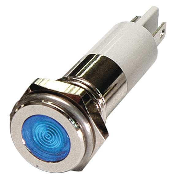 SKU G4659837Categories Lighting ToolsDescription Flat Indicator Light, LED, Brass Plated Chrome, LED, Plastic (ABS), Blue, Voltage 110V AC, Size 10mm Mounting dia, Electrical Connection Male .110 Connector, Shape Round, Current Drawn 4.4 mA, Average Life 100,000 hr, IP Rating 40, Panel Thickness Up to 0.160 in, Standards ROHS$7.71 / eachWeb price