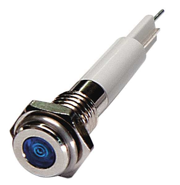 SKU G4650922Categories Lighting ToolsDescription Flat Indicator Light, LED, Brass Plated Chrome, LED, Plastic (ABS), Blue, Voltage 12V DC, Size 6mm Mounting dia, Electrical Connection Lead for Soldering, Shape Round, Current Drawn 20 mA, Average Life 100,000 hr, IP Rating 40, Panel Thickness Up to 0.160 in, Standards ROHS$4.90 / eachWeb price