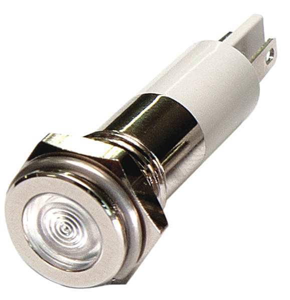 SKU G4705023Categories Lighting ToolsDescription Flat Indicator Light, LED, Brass Plated Chrome, LED, Plastic (ABS), White, Voltage 24V DC, Size 10mm Mounting dia, Electrical Connection Male .110 Connector, Shape Round, Current Drawn 20 mA, Average Life 100,000 hr, IP Rating 40, Panel Thickness Up to 0.160 in, Standards ROHS$7.08 / eachWeb price