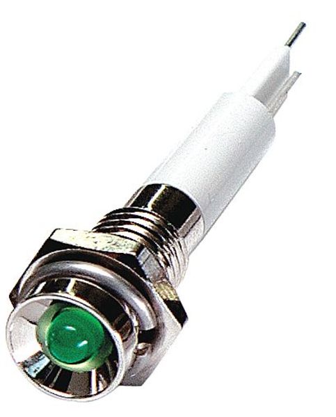 SKU G4670897Categories Lighting ToolsDescription Protruding Indicator Light, LED, Brass Plated Chrome, LED, Plastic (ABS), Green, Voltage 12V DC, Size 6mm Mounting dia, Electrical Connection Lead for Soldering, Shape Round, Current Drawn 20 mA, Average Life 100,000 hr, IP Rating 40, Panel Thickness Up to 0.160 in, Standards ROHS$3.70 / eachWeb price