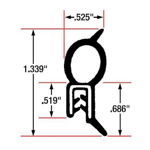Edge Grip Seal, EPDM, 82 ft Length, 0.525 in Overall Width, Style: Top BulbSKU G604393024Categories Lighting ToolsDescription Edge Grip Seal, Application Boat Hatches, Closet Doors, Storage Containers, Tool Boxes, Weatherproofing Seal, Color Black, For Material Thickness 0.079 in, Inside Height 1/2 in, Material EPDM, Maximum Operating Temperature 150 Degrees F, Minimum Operating Temperature -20 Degrees F, Outside Edge Trim Height Not Applicable, Outside Edge Trim Width 9/16 in, Overall Height 9/16 in, Overall Length 82 ft, Overall Width 1/2 in, Profile Shape Top Bulb$311.24 / eachWeb price -