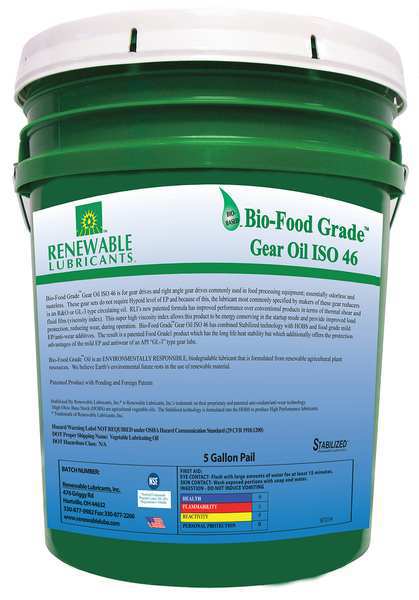 5 gal Bio-Food Grade Gear Oil Pail 46 ISO Viscosity, Light AmberSKU G4575322Categories Lighting ToolsDescription Oil, Food Grade Gear, Food Grade Gear Oil, Size 5 gal., Size/Net Weight 43 lb., Viscosity Index 196, ISO Viscosity Grade 46, Viscosity (SUS @ 100 F) 185, Viscosity (SUS @ 200 F) 45, Temp. Range -5 to 250 Degrees F, Flash Point (F) 466, Pour Point (F) -14.8graingerSKU: 21A558, mscSKU: , zoro_no: G4575322, mongo_id: 65bbe9d322d7a989a997cb9b