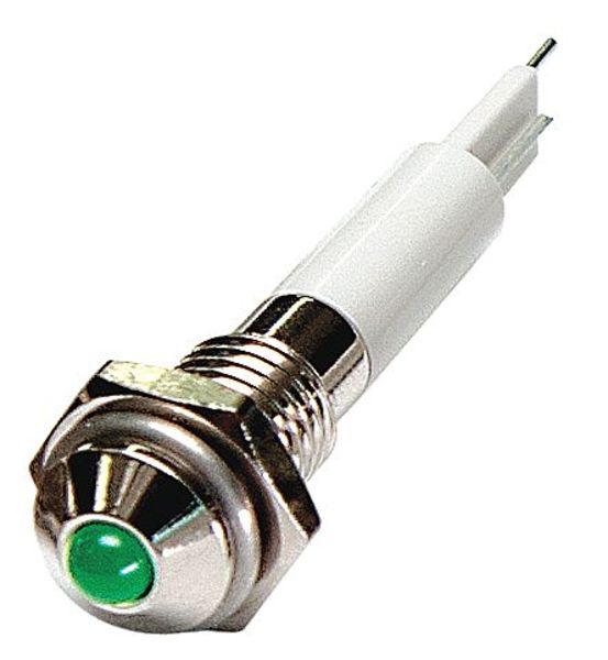 SKU G4670644Categories Lighting ToolsDescription Round Indicator Light, LED, Brass Plated Chrome, LED, Plastic (ABS), Green, Voltage 12V DC, Size 6mm Mounting dia, Electrical Connection Lead for Soldering, Shape Round, Current Drawn 20 mA, Average Life 100,000 hr, IP Rating 40, Panel Thickness Up to 0.160 in, Standards ROHS$5.27 / eachWeb price