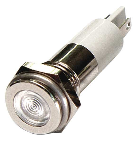 Flat Indicator Light, White, 12VDCSKU G4704813Categories Lighting ToolsDescription Flat Indicator Light, LED, Brass Plated Chrome, LED, Plastic (ABS), White, Voltage 12V DC, Size 10mm Mounting dia, Electrical Connection Male .110 Connector, Shape Round, Current Drawn 20 mA, Average Life 100,000 hr, IP Rating 40, Panel Thickness Up to 0.160 in, Standards ROHS$8.09 / eachWeb price -