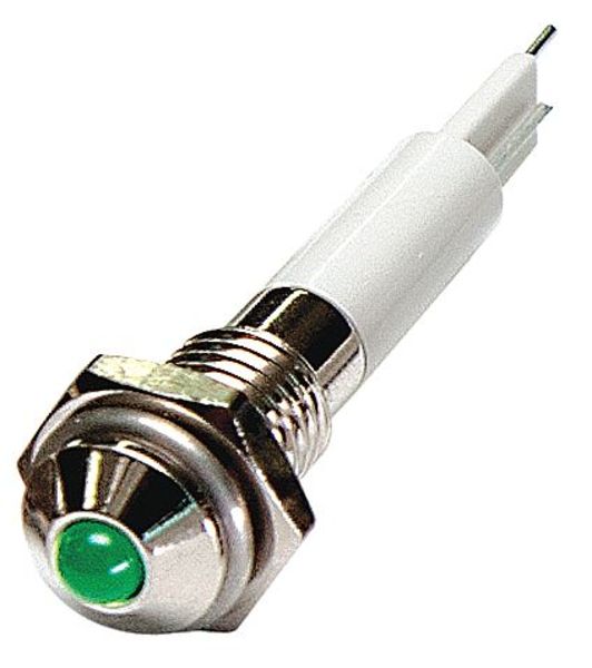 SKU G4686236Categories Lighting ToolsDescription Round Indicator Light, LED, Brass Plated Chrome, LED, Plastic (ABS), Green, Voltage 24V DC, Size 6mm Mounting dia, Electrical Connection Lead for Soldering, Shape Round, Current Drawn 20 mA, Average Life 100,000 hr, IP Rating 40, Panel Thickness Up to 0.160 in, Standards ROHS$4.22 / eachWeb price