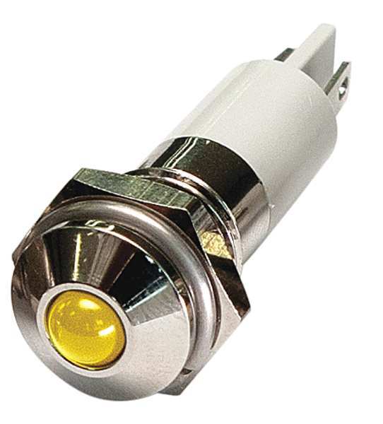 SKU G4656242Categories Lighting ToolsDescription Round Indicator Light, LED, Brass Plated Chrome, LED, Plastic (ABS), Yellow, Voltage 12V DC, Size 10mm Mounting dia, Electrical Connection Male .110 Connector, Shape Round, Current Drawn 20 mA, Average Life 100,000 hr, IP Rating 40, Panel Thickness Up to 0.160 in, Standards ROHS$6.03 / eachWeb price