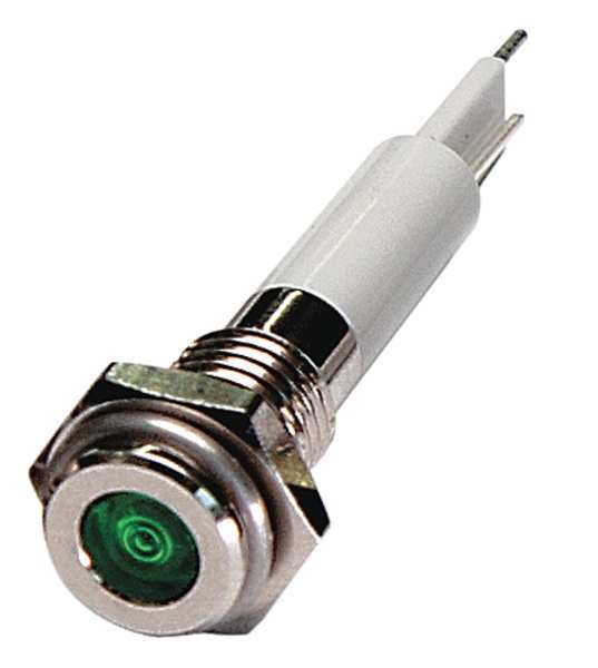 SKU G4682413Categories Lighting ToolsDescription Flat Indicator Light, LED, Brass Plated Chrome, LED, Plastic (ABS), Green, Voltage 24V DC, Size 6mm Mounting dia, Electrical Connection Lead for Soldering, Shape Round, Current Drawn 20 mA, Average Life 100,000 hr, IP Rating 40, Panel Thickness Up to 0.160 in, Standards ROHS$5.61 / eachWeb price