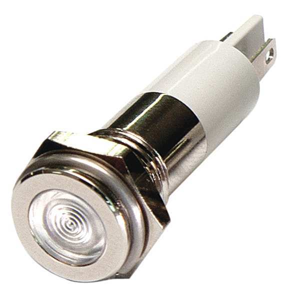 Flat Indicator Light, White, 120VACSKU G4689666Categories Lighting ToolsDescription Flat Indicator Light, LED, Brass Plated Chrome, LED, Plastic (ABS), White, Voltage 110V AC, Size 10mm Mounting dia, Electrical Connection Male .110 Connector, Shape Round, Current Drawn 4.4 mA, Average Life 100,000 hr, IP Rating 40, Panel Thickness Up to 0.160 in, Standards ROHS$8.05 / eachWeb price -