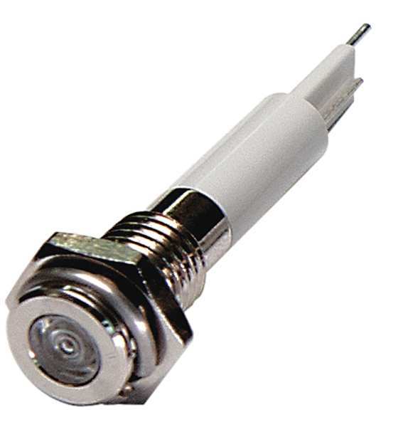 SKU G4697077Categories Lighting ToolsDescription Flat Indicator Light, LED, Brass Plated Chrome, LED, Plastic (ABS), White, Voltage 24V DC, Size 6mm Mounting dia, Electrical Connection Lead for Soldering, Shape Round, Current Drawn 20 mA, Average Life 100,000 hr, IP Rating 40, Panel Thickness Up to 0.160 in, Standards ROHSgraingerSKU: , mscSKU: , zoro_no: G4697077, mongo_id: 65bbe7063aaddbd5a906b87a