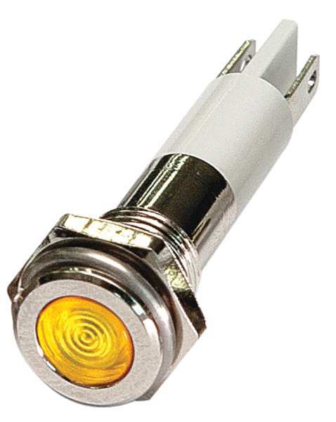 SKU G4650405Categories Lighting ToolsDescription Flat Indicator Light, LED, Brass Plated Chrome, LED, Plastic (ABS), Yellow, Voltage 12V DC, Size 8mm Mounting dia, Electrical Connection Male .110 Connector, Shape Round, Current Drawn 20 mA, Average Life 100,000 hr, IP Rating 40, Panel Thickness Up to 0.160 in, Standards ROHSgraingerSKU: , mscSKU: , zoro_no: G4650405, mongo_id: 65bbe7063aaddbd5a906b881
