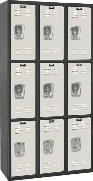 Wardrobe Locker, 36 in W, 18 in D, 72 in H, (3) Tier, (3) Wide, Light Gray/BlackSKU G2202448Categories Lighting ToolsDescription Wardrobe Locker, Audit Trail Storage None, Frame Assembled Assembled, Number of Tiers 3, Number of Units Wide 3, Door Type Louvered, Frame Material Thickness 16 ga, Includes Number Plates Yes, Locker Color Light Gray/Black, Lock Type Padlock Hasp, Overall Depth 18 in, Overall Height 72 in, Overall Width 36 in, Handle Type Recessed Lift, Locker Finish Powder Coated, Locker Material Steel, Number of Lockers 9, Opening Depth 17 in, Opening Height 22 1/4 in, Opening Width 9 1/4 ingraingerSKU: 35UW87, mscSKU: , zoro_no: G2202448, mongo_id: 65bbe8f722d7a989a99283ed