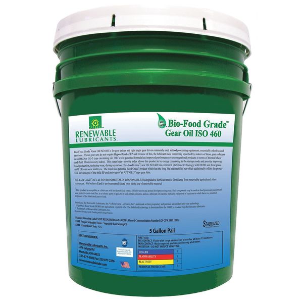 5 gal Bio-Food Grade Gear Oil Pail Light AmberSKU G2801346Categories Lighting ToolsDescription Gear Oil,Synthetic Oil Base,Size 5 gal.,Container Type Pail,SAE Grade Not Specified,ISO Viscosity Grade 460,Viscosity Index 216,Temp. Range 23 Degrees to 250 Degrees F,Pour Point 23 Degrees C,Flash Point 527 Degrees C,Dropping Point Not Speficied,Four-Ball Wear Not Specified,Timken OK Load Not Specified,Viscosity @ 40C 2500 cSt,Viscosity @ 100C Not Specified,Application For Gear Drives and Right Angle Gear Drives Used in Food Processing EquipmentgraingerSKU: 5JGH0, mscSKU: 62680715, zoro_no: G2801346, mongo_id: 65bbe7fe22d7a989a98d07d7
