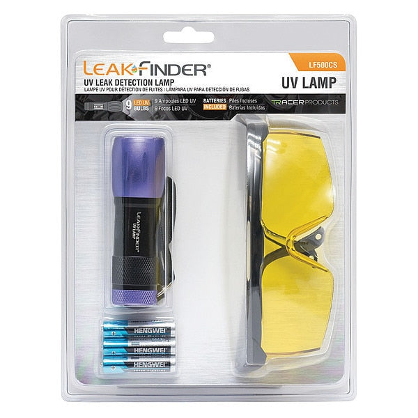 SKU G8043525Categories Lighting ToolsDescription UV Flashlight, Tool Type Leak Detector UV Flashlight, Testing Application A/C System, Coolant, Oil, Material Metal, Number of Pieces 1, Features 5 ft Inspection, Violet LED Light, Includes (3) AAA Batteries, Lanyard, Overall Length Not Applicable, Overall Width Not Applicable$41.49 / eachWeb price