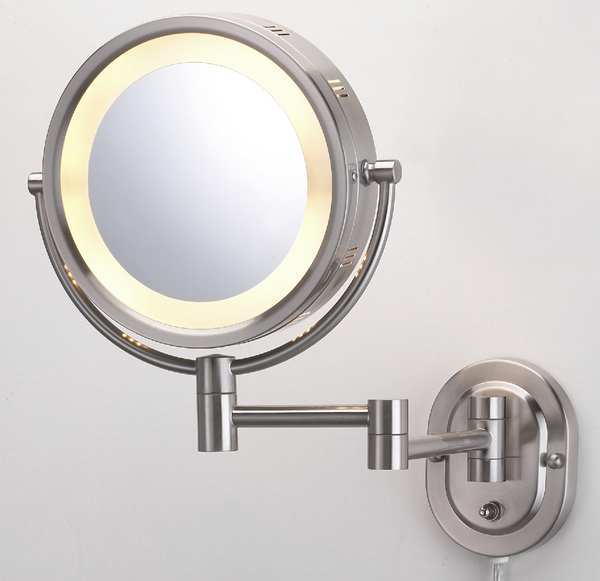SKU G5415837Categories Lighting ToolsDescription Lighted Makeup Mirror, Shape Round, Tilt Type Fixed, Overall Height 13 in, Overall Width 10 in, Frame Finish Nickel, Mounting Location Wall, Power Source Electric Corded, Mirror Surface Glass, Mirror Type With Frame, Includes Lamps Yes, Lamp Type Incandescent, Magnification 5X, Overall Diameter 8 in, ADA Compliant No, Product Type Makeup Mirror, Arm Length 14 in, Cord Length 6 ft, Frame Material Metal, Includes Mounting Hardware Yes, Number of Sides 2, Overall Depth 4 in, Plug Type 2 PronggraingerSKU: 30AC18, mscSKU: , zoro_no: G5415837, mongo_id: 65bbe7ee22d7a989a98c969f