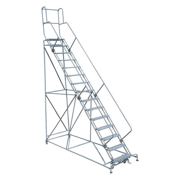 192 in H Steel Rolling Ladder, 15 StepsSKU G2156135Categories Material HandlingDescription Rolling Ladder, Material Steel, Platform Height 150 in, Handrails Included Yes, Handrail Height 30 in, Overall Height 192 in, Number of Steps 15, Unassembled, Load Capacity 450 lb, Step Tread Expanded Metal, Platform Depth 24 in, Platform Width 24 in, Bottom Width 42 in, Base Depth 155 in, Overall Width 42 in, Climbing Angle 50 Degrees , Step Depth 7 in, Step Width 24 in, Ladder Actuation Foot Activated Step Lock, Finish Powder Coated, Color Gray, Standards ANSI, OSHAgraingerSKU: 45CJ24, mscSKU: , zoro_no: G2156135, mongo_id: 65bbe93c22d7a989a99419fd