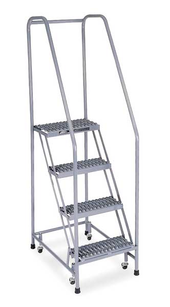 SKU G204390522Categories Antislip Tapes, Treads & Stair Nosings , Material HandlingDescription Rolling Ladder, Material Aluminum, Platform Height 40 in, Handrails Included Yes, Handrail Height 32 in, Overall Height 72 in, Number of Steps 4, Assembled, Load Capacity 350 lb, Step Tread Ribbed, Platform Depth 14 in, Platform Width 16 in, Bottom Width 22 in, Base Depth 37 in, Overall Width 22 in, Climbing Angle 56 Degrees , Step Depth 7 in, Step Width 16 in, Ladder Actuation Spring-Loaded Casters, Finish Aluminum Mill, Color Aluminum, Standards ANSI, OSHA, Includes Crutch TipsgraingerSKU: 29RK08, mscSKU: , zoro_no: G204390522, mongo_id: 65bbe91622d7a989a99333e7