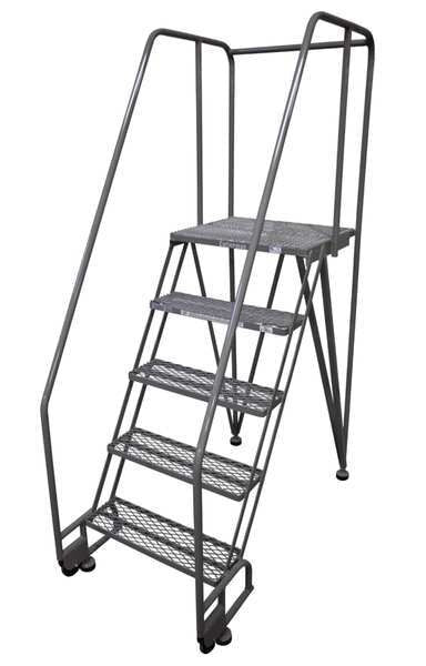 80 in H Steel Tilt and Roll Ladder, 5 StepsSKU G9855736Categories Material HandlingDescription Tilt and Roll Ladder, Material Steel, Platform Height 50 in, Handrails Included Yes, Handrail Height 30 in, Overall Height 80 in, Number of Steps 5, Assembled, Load Capacity 350 lb, Step Tread Serrated, Platform Depth 20 in, Platform Width 24 in, Bottom Width 28 in, Base Depth 54 in, Overall Width 28 in, Climbing Angle 59 Degrees , Step Depth 7 in, Step Width 24 in, Ladder Actuation None, Finish Powder Coated, Color Gray, Standards ANSI, OSHA, Includes Double Handrails, Rear Exit NograingerSKU: 6MXV8, mscSKU: , zoro_no: G9855736, mongo_id: 65bbe91622d7a989a993341d