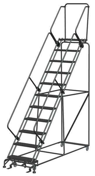 143 in H Steel Rolling Ladder, 11 StepsSKU G9839453Categories Material HandlingDescription Rolling Ladder, Material Steel, Platform Height 110 in, Handrails Included Yes, Handrail Height 30 in, Overall Height 143 in, Number of Steps 11, Unassembled, Load Capacity 450 lb, Step Tread Perforated, Platform Depth 14 in, Platform Width 24 in, Bottom Width 32 in, Base Depth 101 in, Overall Width 32 in, Climbing Angle 50 Degrees , Step Depth 7 in, Step Width 24 in, Ladder Actuation Foot Activated Step Lock, Finish Powder Coated, Color Gray, Standards ANSI, OSHAgraingerSKU: 9JAM3, mscSKU: , zoro_no: G9839453, mongo_id: 65bbe91622d7a989a99333f8