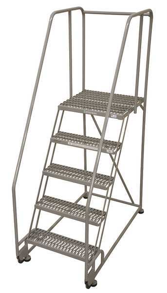 86 in H Steel Rolling Ladder, 5 StepsSKU G0979076Categories Material HandlingDescription Rolling Ladder, Material Steel, Platform Height 50 in, Handrails Included Yes, Handrail Height 36 in, Overall Height 86 in, Number of Steps 5, Unassembled, Load Capacity 450 lb, Step Tread Serrated, Platform Depth 10 in, Platform Width 24 in, Bottom Width 30 in, Base Depth 42 in, Overall Width 30 in, Climbing Angle 56 Degrees , Step Depth 7 in, Step Width 24 in, Ladder Actuation Spring-Loaded Casters, Finish Powder Coated, Color Gray, Standards ANSI, OSHA, Includes Crutch TipsgraingerSKU: 25NW54, mscSKU: , zoro_no: G0979076, mongo_id: 65bbe91622d7a989a99333cf