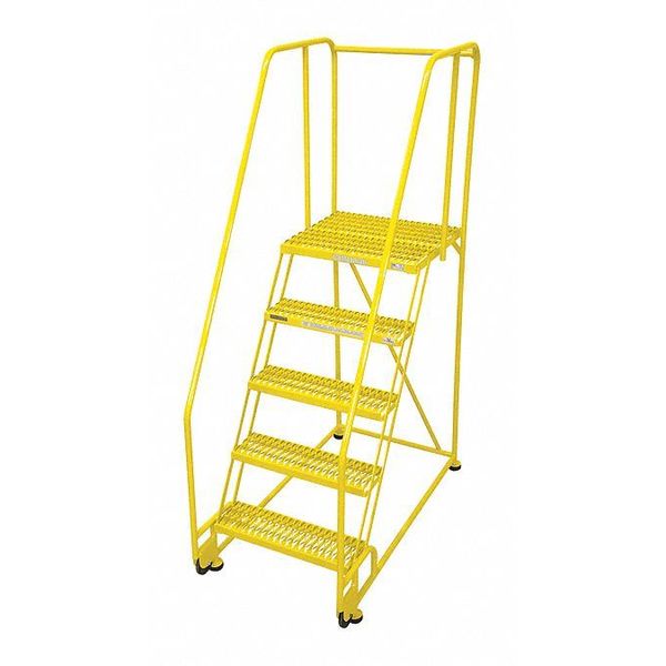 SKU G1002219Categories Material HandlingDescription Tilt and Roll Ladder, Material Steel, Platform Height 50 in, Handrails Included Yes, Handrail Height 30 in, Overall Height 80 in, Number of Steps 5, Assembled, Load Capacity 450 lb, Step Tread Expanded Metal, Platform Depth 20 in, Platform Width 16 in, Bottom Width 53 in, Base Depth 20 in, Overall Width 20 in, Climbing Angle 59 Degrees , Step Depth 7 in, Step Width 16 in, Ladder Actuation None, Finish Powder Coated, Color Yellow, Standards ANSI, OSHA, Rear Exit NograingerSKU: 21VD47, mscSKU: , zoro_no: G1002219, mongo_id: 65bbe91622d7a989a9933415