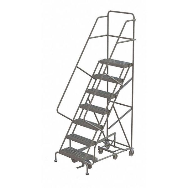 SKU G2137829Categories Material HandlingDescription Rolling Ladder, Material Steel, Platform Height 70 in, Handrails Included Yes, Handrail Height 30 in, Overall Height 100 in, Number of Steps 7, Assembled, Load Capacity 450 lb, Step Tread Expanded Metal, Platform Depth 12 in, Platform Width 24 in, Bottom Width 30 in, Base Depth 69 in, Overall Width 30 in, Climbing Angle 50 Degrees , Step Depth 7 in, Step Width 24 in, Ladder Actuation Foot Activated Step Lock, Finish Powder Coated, Color Gray, Standards ANSI, OSHA, Rear Exit NograingerSKU: 4XM59, mscSKU: , zoro_no: G2137829, mongo_id: 65bbe8ef22d7a989a9925032
