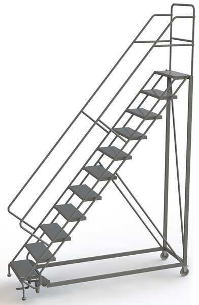 SKU G9906723Categories Material HandlingDescription Configurable Rolling Ladder, Material Steel, Platform Height 110 in, Handrails Included Yes, Handrail Height 36 in, Overall Height 146 in, Number of Steps 11, Unassembled, Load Capacity 450 lb, Step Tread Perforated, Platform Depth 17 in, Platform Width 24 in, Bottom Width 35 in, Base Depth 107 in, Overall Width 35 in, Climbing Angle 50 Degrees , Step Depth 8 1/2 in, Step Width 24 in, Ladder Actuation Foot Activated Step Lock, Finish Powder Coated, Color Gray, Standards ANSI, OSHAgraingerSKU: 29RJ55, mscSKU: , zoro_no: G9906723, mongo_id: 65bbe8ef22d7a989a9924ff6