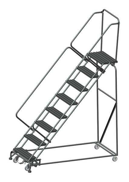 SKU G9841011Categories Material HandlingDescription Rolling Ladder, Material Steel, Platform Height 80 in, Handrails Included Yes, Handrail Height 30 in, Overall Height 113 in, Number of Steps 8, Assembled, Load Capacity 450 lb, Step Tread Serrated, Platform Depth 14 in, Platform Width 24 in, Bottom Width 32 in, Base Depth 74 in, Overall Width 32 in, Climbing Angle 50 Degrees , Step Depth 7 in, Step Width 24 in, Ladder Actuation Weight Activated Step Lock, Finish Powder Coated, Color Gray, Standards ANSI, OSHAgraingerSKU: 9EWE7, mscSKU: , zoro_no: G9841011, mongo_id: 65bbe8ef22d7a989a9925016