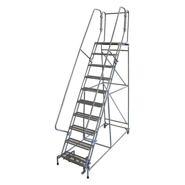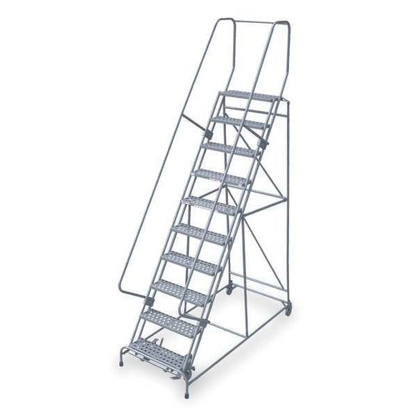 130 in H Steel Rolling Ladder, 10 StepsSKU G9930977Categories Material HandlingDescription Rolling Ladder, Material Steel, Platform Height 100 in, Handrails Included Yes, Handrail Height 30 in, Overall Height 130 in, Number of Steps 10, Unassembled, Load Capacity 450 lb, Step Tread Serrated, Platform Depth 30 in, Platform Width 24 in, Bottom Width 32 in, Base Depth 92 in, Overall Width 32 in, Climbing Angle 59 Degrees , Step Depth 7 in, Step Width 24 in, Ladder Actuation Foot Activated Step Lock, Finish Powder Coated, Color Gray, Standards ANSI, OSHA, Includes 1 in Crutch TipsgraingerSKU: 20Z246, mscSKU: , zoro_no: G9930977, mongo_id: 65bbe8c922d7a989a9916927
