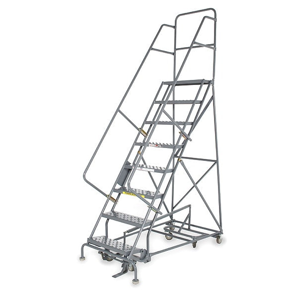 SKU G604390351Categories Antislip Tapes, Treads & Stair Nosings , Material HandlingDescription Rolling Ladder, Material Aluminum, Platform Height 70 in, Handrails Included Yes, Handrail Height 32 in, Overall Height 102 in, Number of Steps 7, Assembled, Load Capacity 350 lb, Step Tread Ribbed, Platform Depth 14 in, Platform Width 16 in, Bottom Width 26 in, Base Depth 57 in, Overall Width 26 in, Climbing Angle 56 Degrees , Step Depth 7 in, Step Width 16 in, Ladder Actuation Spring-Loaded Casters, Finish Aluminum Mill, Color Aluminum, Standards ANSI, OSHA, Includes Crutch TipsgraingerSKU: 29RK11, mscSKU: , zoro_no: G604390351, mongo_id: 65bbe8c922d7a989a99168c9