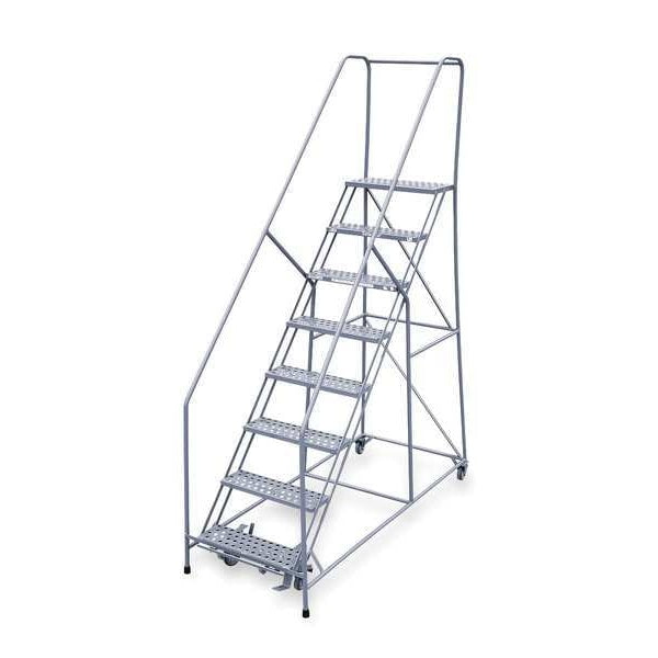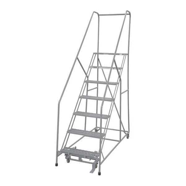 100 in H Steel Rolling Ladder, 7 StepsSKU G3492365Categories Material HandlingDescription Rolling Ladder, Material Steel, Platform Height 70 in, Handrails Included Yes, Handrail Height 30 in, Overall Height 100 in, Number of Steps 7, Assembled, Load Capacity 450 lb, Step Tread Expanded Metal, Platform Depth 24 in, Platform Width 30 in, Bottom Width 32 in, Base Depth 81 in, Overall Width 32 in, Climbing Angle 50 Degrees , Step Depth 7 in, Step Width 30 in, Ladder Actuation Foot Activated Step Lock, Finish Powder Coated, Color Gray, Standards ANSI, OSHA, Rear Exit NograingerSKU: 21UV41, mscSKU: , zoro_no: G3492365, mongo_id: 65bbe8c922d7a989a9916921