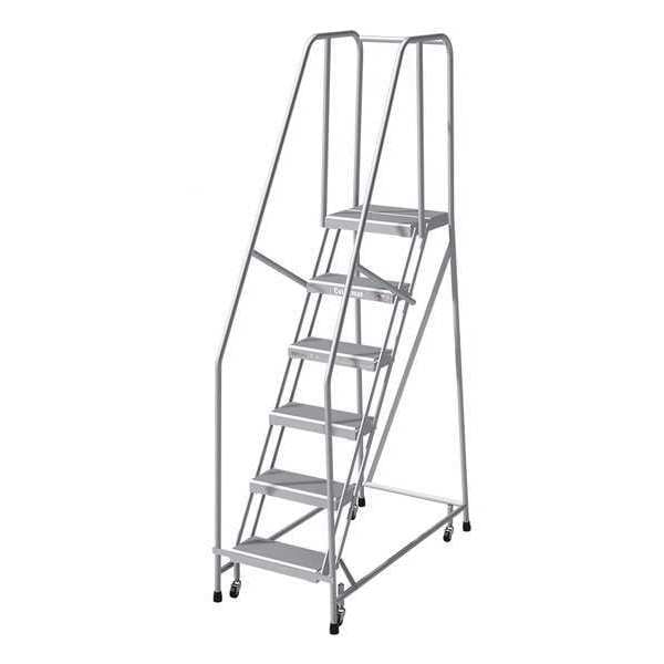 90 in H Aluminum Rolling Ladder, 6 StepsSKU G1000295Categories Material HandlingDescription Rolling Ladder, Material Aluminum, Platform Height 60 in, Handrails Included Yes, Handrail Height 30 in, Overall Height 90 in, Number of Steps 6, Assembled, Load Capacity 350 lb, Step Tread Ribbed, Platform Depth 14 in, Platform Width 16 in, Bottom Width 24 in, Base Depth 50 in, Overall Width 24 in, Climbing Angle 59 Degrees , Step Depth 7 in, Step Width 16 in, Ladder Actuation Weight Activated Step Lock, Finish Aluminum Acid Brightened, Color Natural, Standards ANSI, OSHA, Rear Exit NograingerSKU: 21VE82, mscSKU: , zoro_no: G1000295, mongo_id: 65bbe8c922d7a989a9916919