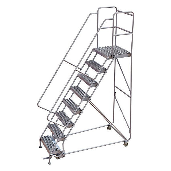 $1,269.99 / eachWeb price113 in H Steel Rolling Ladder, 8 StepsSKU G9843452Categories Material HandlingDescription Rolling Ladder, Material Steel, Platform Height 80 in, Handrails Included Yes, Handrail Height 30 in, Overall Height 113 in, Number of Steps 8, Unassembled, Load Capacity 450 lb, Step Tread Abrasive Mat, Platform Depth 14 in, Platform Width 24 in, Bottom Width 32 in, Base Depth 61 in, Overall Width 32 in, Climbing Angle 59 Degrees , Step Depth 7 in, Step Width 24 in, Ladder Actuation Foot Activated Step Lock, Finish Powder Coated, Color Gray, Standards ANSI, OSHAgraingerSKU: 8YED2, mscSKU: , zoro_no: G9843452, mongo_id: 65bbe8569a749db822787b53