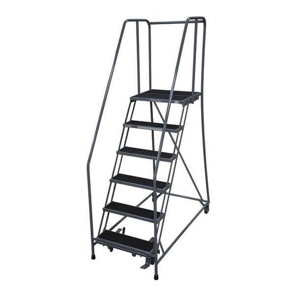 SKU G0998457Categories Material HandlingDescription Rolling Ladder, Material Steel, Platform Height 60 in, Handrails Included Yes, Handrail Height 30 in, Overall Height 90 in, Number of Steps 6, Unassembled, Load Capacity 450 lb, Step Tread Serrated, Platform Depth 20 in, Platform Width 24 in, Bottom Width 30 in, Base Depth 96 in, Overall Width 30 in, Climbing Angle 59 Degrees , Step Depth 7 in, Step Width 24 in, Ladder Actuation Foot Activated Step Lock, Finish Powder Coated, Color Gray, Standards ANSI, OSHA, Rear Exit NograingerSKU: 21UW62, mscSKU: , zoro_no: G0998457, mongo_id: 65bbe87822d7a989a98f9f36